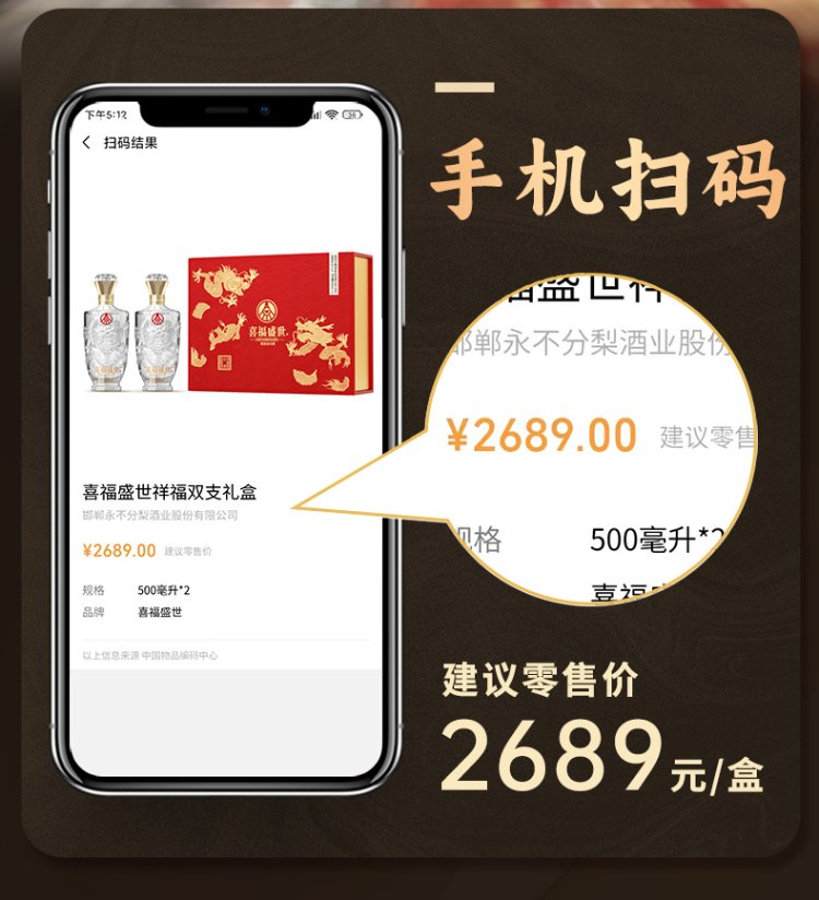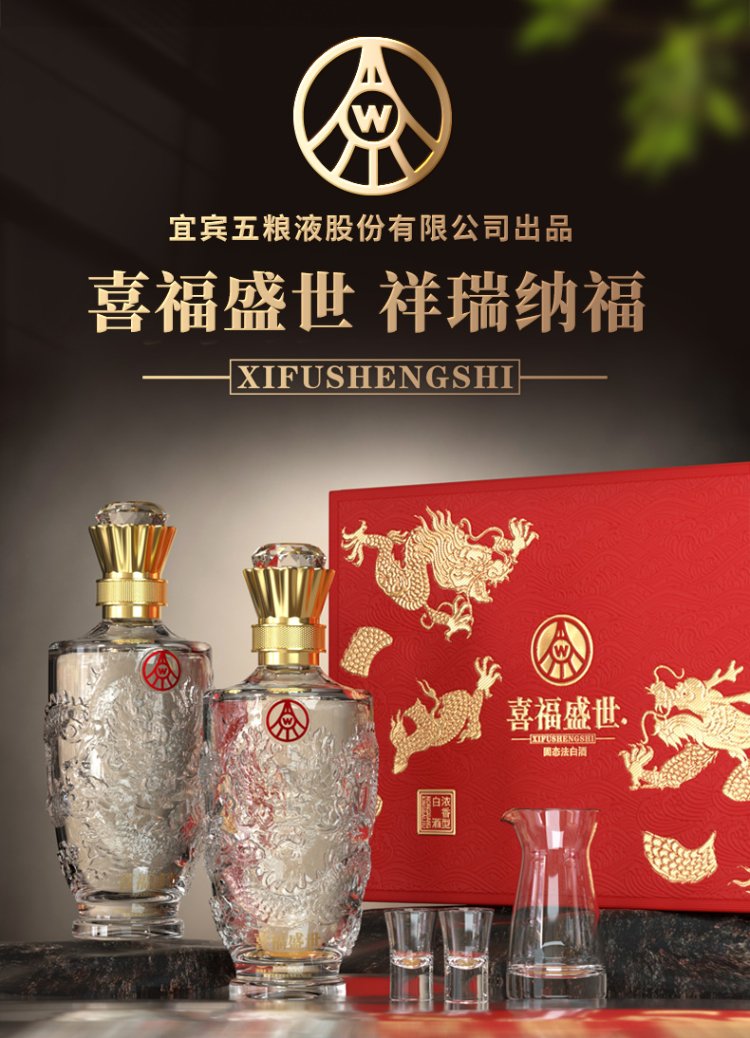 五粮液股份出品 喜福盛世祥福双支礼盒52%VOL浓香型优级白酒 500ml*2瓶/盒